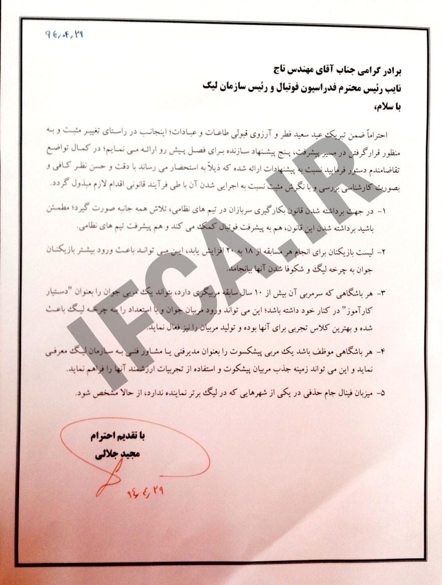 به‌گزارش خبرگزاری تسنیم و به نقل از سایت رسمی کانون مربیان فوتبال ایران(ifca.ir)، مجید جلالی با ارسال نامه‌ای رسمی به مهدی تاج، رئیس سازمان لیگ پنج پیشنهاد برای بالا رفتن کیفیت رقابت‌های لیگ برتر ارائه کرد.