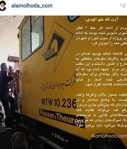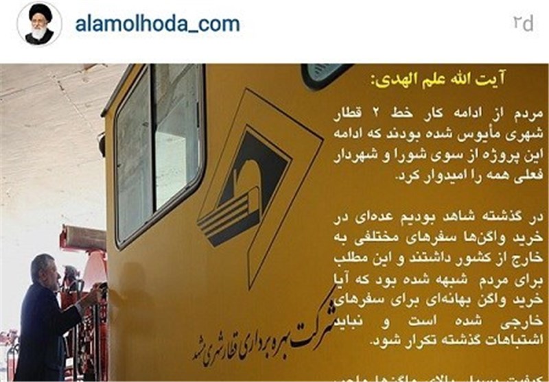 به گزارش خبرگزاری تسنیم از مشهد مقدس، در صفحه اینستاگرام آیت الله سید احمد علم الهدی، امام جمعه مشهد مقدس و عضو مجلس خبرگان رهبری پیامی در ارتباط با قطار شهری مشهد مقدس منتشر شده است.