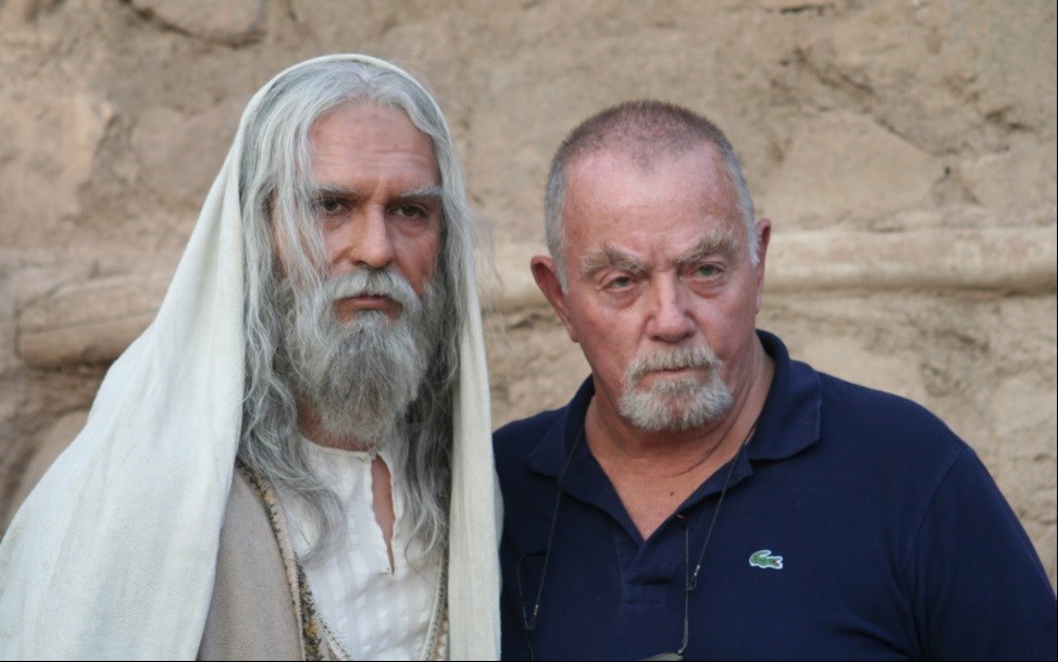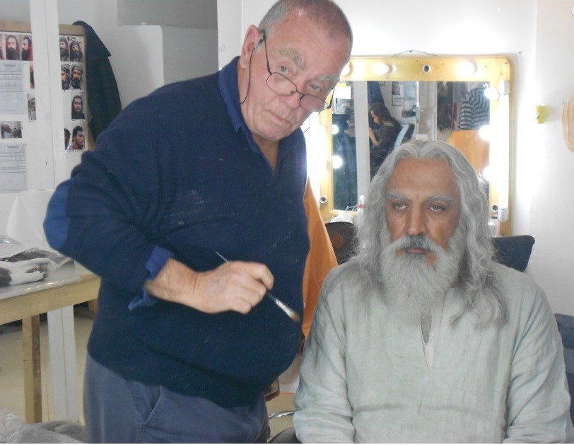جیانتو دروسی در حال طراحی چهره نقش حضرت عبدالمطلب که علیرضا شجاع نوری آن را ایفا کرده است.