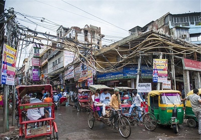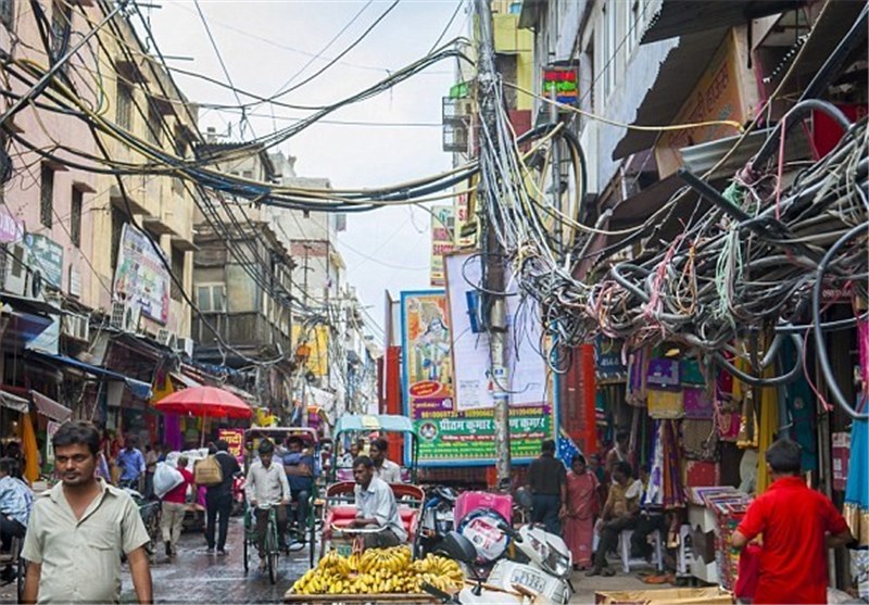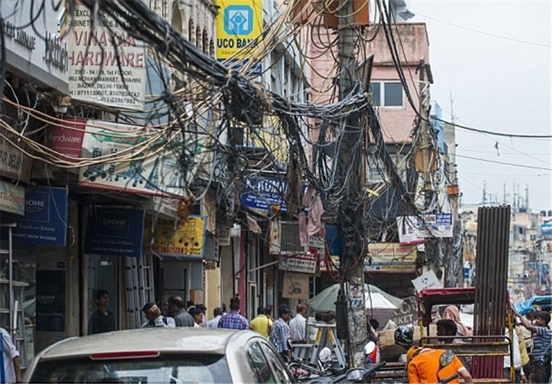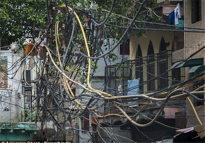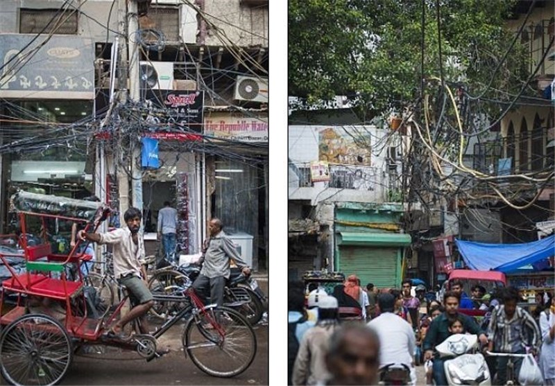 در این تصاویر ساکنان این منطقه از دهلی نو در انبوهی از کابلهای برق با ولتاژ بالا زندگی و رفت و آمد میکنند؛ کابلهایی که گاها تا نزدیکی زمین کشیده شده و در واقع به کلافهایی در هم تنیده شبیهاند.
