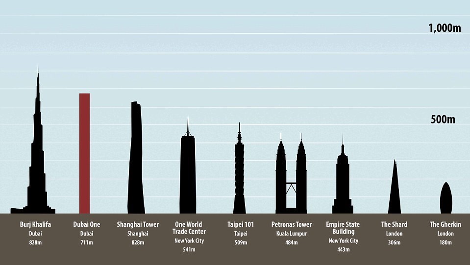 به‌گزارش گروه بین‌الملل خبرگزاری تسنیم، هرچند شهر دوبی هم‌اکنون میزبان مرتفع‌ترین سازه‌ساخت دست بشر (برج خلیفه) به‌ارتفاع 828 متر است ــ این برج کاربرد ترکیبی تجاری، مسکونی و تفریحی دارد ــ اما مقامات این شهر اعلام کرده‌اند قصد دارند که بلندمرتبه‌ترین برج صرفاً مسکونی جهان را نیز با ارتفاع 711 متر در این دولت‌شهرِ در حال رشد بنا کنند. این برج نام «دوبی یک» (Dubai One) را خواهد داشت و بخشی از یک مجموعه بزرگتر 4.3 میلیارد دلاری تحت عنوان «میدان یک» است که گنجایش سکونت 78هزار نفر را دارد. این مجموعه شامل 885 آپارتمان، یک فواره رقصان، یک مرکز خرید، یک هتل 350اتاقه و تفرجگاه ساحلی است. همچنین بزرگترین مجموعه اسکی مسقف جهان را در بر خواهد گرفت.