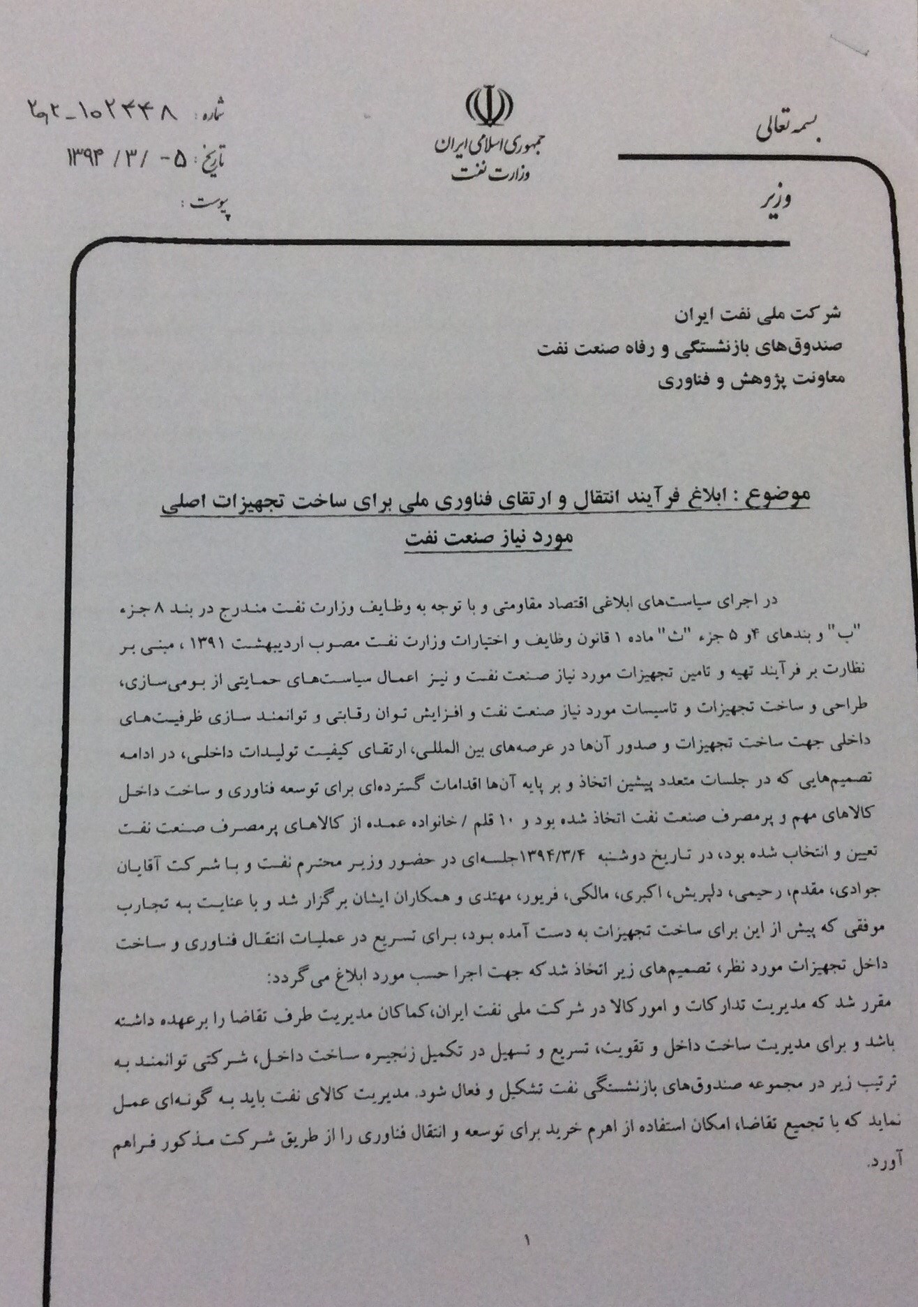 ابلاغیه فرآیند انتقال و ارتقای فناوری ملی برای ساخت تجهیزات اصلی مورد نیاز صنعت نفت
