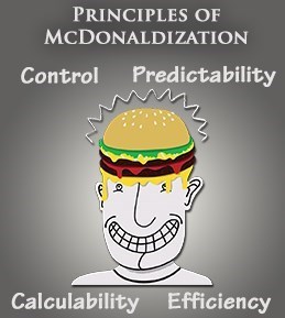 با توجه به اطلاعاتی که ریتزر در کتاب خود منتشر میکند، ابعاد چهارگانه مکدونالدسازی شامل کارایی، محاسبهپذیری، پیشبینی پذیری و کنترل است. محاسبهپذیری در معنا و شکلدیگر نشان دهنده مصرفگرایی است. مصرفیگرایی که نه ضابطه دارد و نه معیار تولید و مبنای آن فقط تعیین خروجیهای براساس قابلیت سنجش است. به زبان دیگر باید گفت کمیت بر کیفیت ارجح است. آنها ساندویچهای بزرگی را میفروشند اما نه ساندویچهای خوبی.