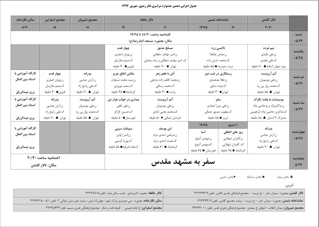 نمایشهای بخش دهمین جشنواره تئاتر رضوی، علاوه بر آنکه در سالنهای گلشن، حافظ ، شمس و نگارخانه اجرا می شود، در دو شهرستان اسفراین و شیروان نیز به صورت انتخابی به روی صحنه خواهد رفت.