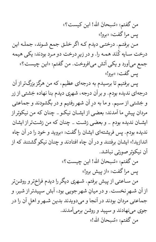 من ساعتی از پیش برفتم. شهری دیگر را دیدم فراختر و روشنتر از آن شهرِ نخست. و در میانِ شهر جویی بود، آبش سپیدتر از شیر. و جماعتی مردان بودند در آنجا و میدویدند بدین شهر و اهلِ آن را در جوی مینهادند و سپید و روشن برمیآمدند.