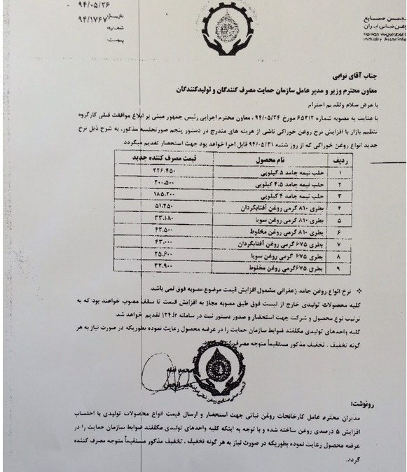 براساس مصوبه انجمن صنایع روغن نباتی ایران که به کارخانجات روغن نباتی ابلاغ شده آمده است :
