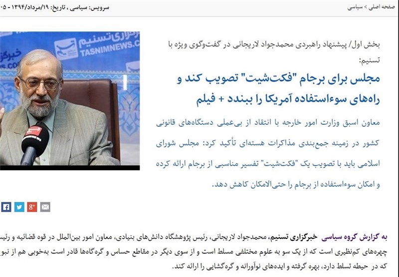 چندی پیش محمدجواد لاریجانی، دیپلمات کهنهکار کشورمان و بنیانگذار مرکز مطالعات وزارت امور خارجه که در جریان مذاکرات مهم مربوط به قطعنامه 598 نیز از مذاکرهکنندگان ارشد کشورمان بود، در گفتوگویی با تسنیم پیشنهاد مهمی را به نمایندگان مجلس شورای اسلامی ارائه کرد. محمدجواد لاریجانی با پیشبینی آنچه هماینک در دستگاه حکومتی آمریکا در حال رخ دادن است، تأکید کرده بود: "اولاً بهتر است برای خالینکردن پشت دولت و جلوگیری از خدشه به اعتبار دولت یازدهم در عرصه بینالملل، مجلس شورای اسلامی به دولت اجازه "اجرای" برجام را بدهد؛ با این حال نمایندگان مجلس شورای اسلامی باید با بررسی دقیق برجام، یک فکتشیت برای آن تصویب کرده و راههای سوءاستفادههای بزرگ از برجام را ببندند". (متن کامل مصاحبه را از اینجا بخوانید)