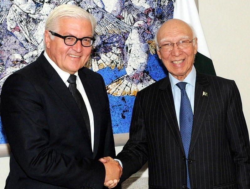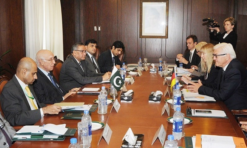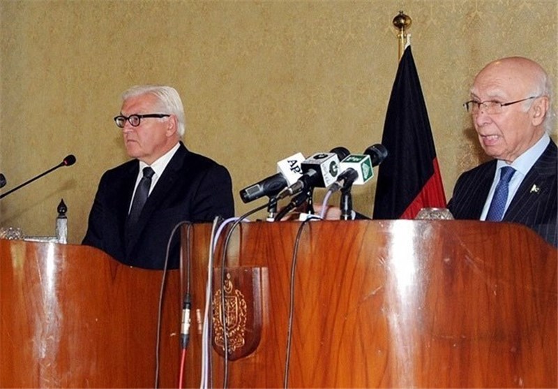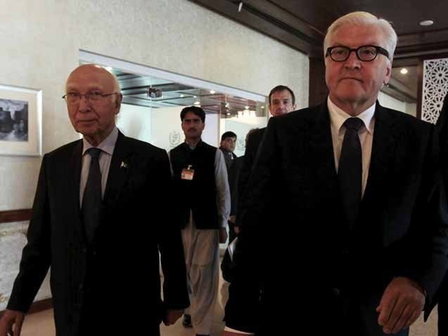 سرتاج عزیز مشاور امنیت ملی و امور بین‌الملل نخست‌وزیر پاکستان نیز در این نشست خبری مشترک با وزیر امور خارجه آلمان در مورد روابط دوجانبه با این کشور، امور منطقه‌ای و بین‌المللی و بویژه روابط اسلام‌آباد با کابل و تعلیق مذاکرات هند و پاکستان به بحث و گفت‌وگو پرداخت.