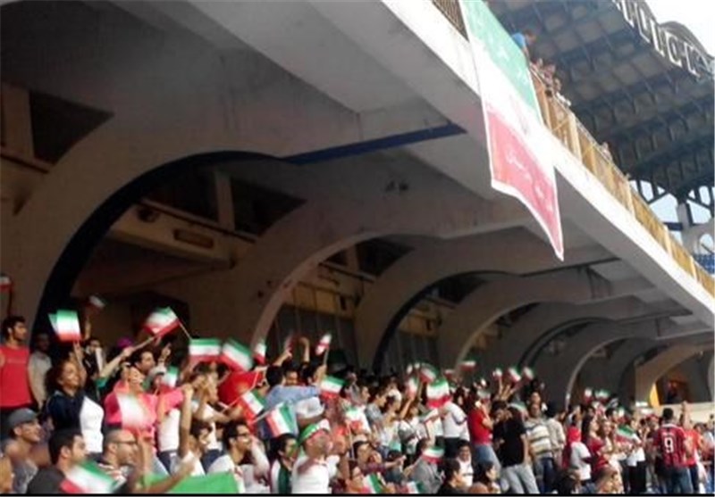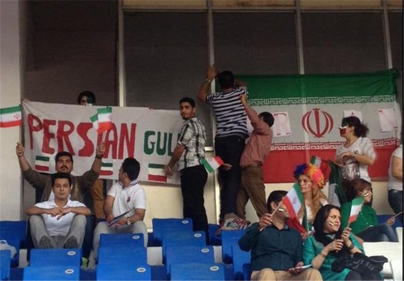 * تماشاگران ایرانی حاضر در ورزشگاه با پلاکاردی که روی آن «خلیج فارس» نوشته شده در ورزشگاه حاضر شدهاند و به تشویق ایران میپردازند.