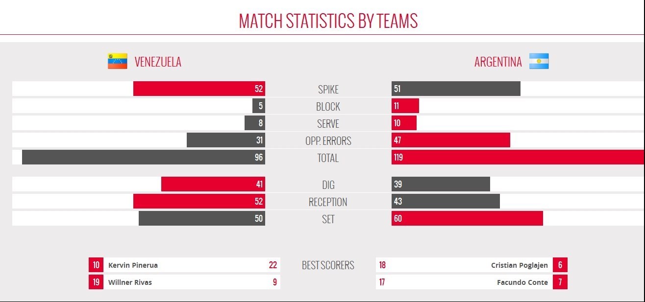 در این بازی کریستین پوگلاخن 18 امتیاز برای آرژانتین و کروین پینهروآ 22 امتیاز برای ونزوئلا کسب کردند.