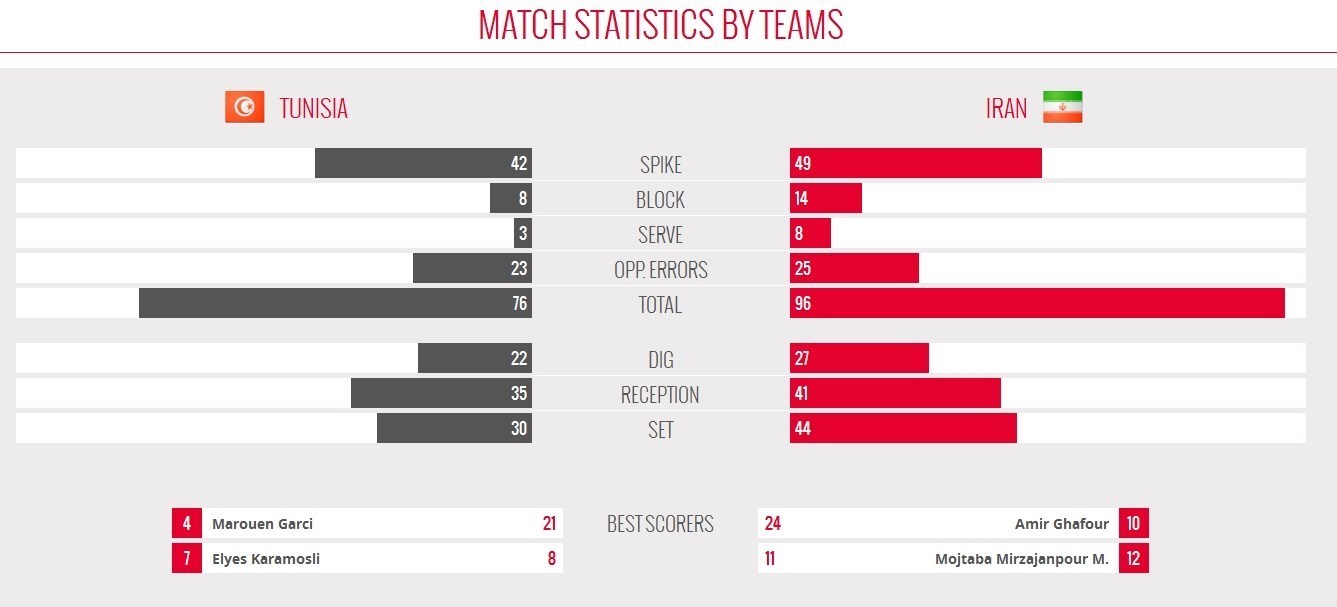ایران موفق شد در این بازی 49 امتیاز از حمله، 14 امتیاز از دفاع، 8 امتیاز از سرویس و 25 امتیاز از اشتباهات حریف به دست آوردند. بازیکنان تونس نیز 42 امتیاز از حمله، 8 امتیاز از دفاع، 3 امتیاز از سرویس و 23 امتیاز از اشتباهات ایران کسب کردند.
