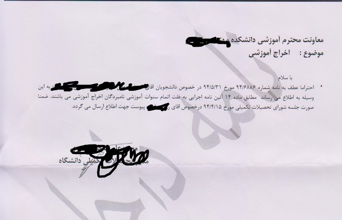 این دانشجو به‌دلیل عدم توانایی در پرداخت شهریه تحصیل و اتمام سنوات آموزشی با داشتن مراتب علمی مناسب با وضعیت اخراج آموزشی مواجه شده است.