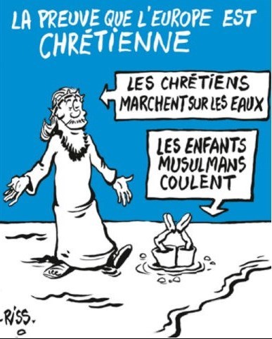 در دومین کاریکاتور، "اثبات اینکه مسیحیان روی آب راه میروند" یک مرد نشان داده شده که ظاهرا حضرت مسیح است و بر روی آب راه میرود. کودکی نیز که در آب غوطهور شده میگوید: "کودکان مسلمان غرق میشوند."