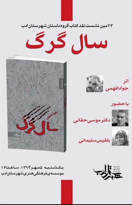 در این نشست که ساعت 16 روز یکشنبه 5 مهر ماه برگزار خواهدشد دکتر موسی حقانی و بلقیس سلیمانی به بررسی رمان «سال گرگ» خواهندپرداخت.