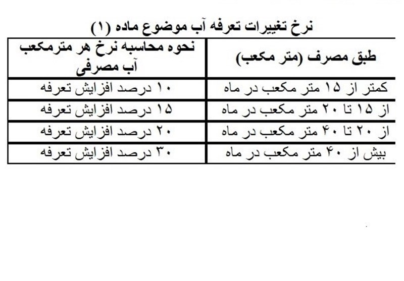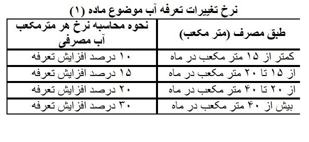 ماده 1. نرخ تعرفه های آب شرب شهری موضوع مصوبه هیأت وزیران به شماره 181552 /ت 50150هـ مورخ 06 /12 /92، در کاربری های خانگی به ازای هر واحد مسکونی برای بازه مصارف کمتر از 15 متر مکعب در ماه به میزان 10 درصد، برای بازه مصارف از 15 تا 20 متر مکعب در ماه به میزان 15 درصد، برای مصارف بیش از 20 تا 40 متر مکعب در ماه به میزان 20 درصد، برای مصارف بیش از 40 متر مکعب در ماه به میزان 30 درصد و برای کاربری های غیرخانگی به میزان 20 درصد افزایش می یابد.
