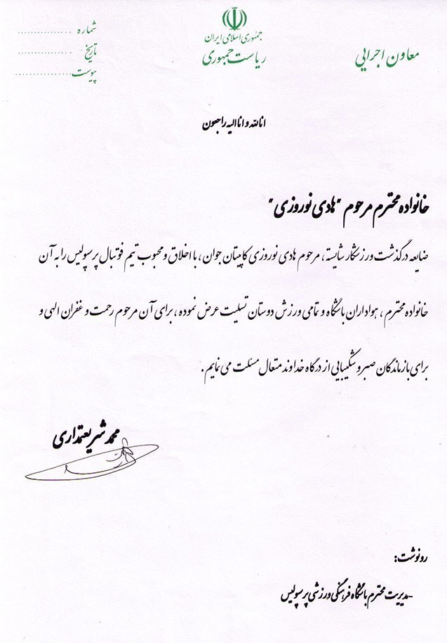 در پیام معاون اجرایی رئیس جمهور آمده است:« درگذشت ورزشکار شایسته، مرحوم هادی نوروزی کاپیتان جوان، با اخلاق و محبوب تیم فوتبال پرسپولیس موجی از اندوه را در میان آحاد جامعه ایجاد کرد. این ضایعه را به خانواده محترم آن مرحوم، جامعه ورزش، باشگاه و خانواده پرسپولیس تسلیت عرض نموده، از درگاه ایزد منان برای آن مرحوم رحمت و غفران الهی و برای بازماندگان صبر و شکیبایی را خواستارم».