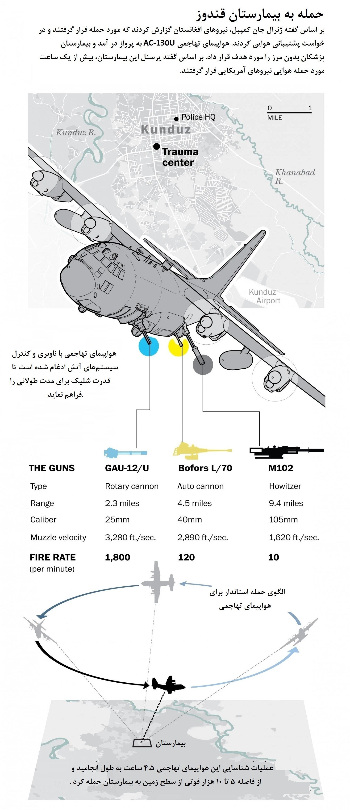 هواپیمای(AC-130U) در تاریکی هوا به پرواز در آمد و این بیمارستان را با توپ جنگی مجهز به مهمات انفجاری قوی بیش از یک ساعت مورد حمله قرار داد.