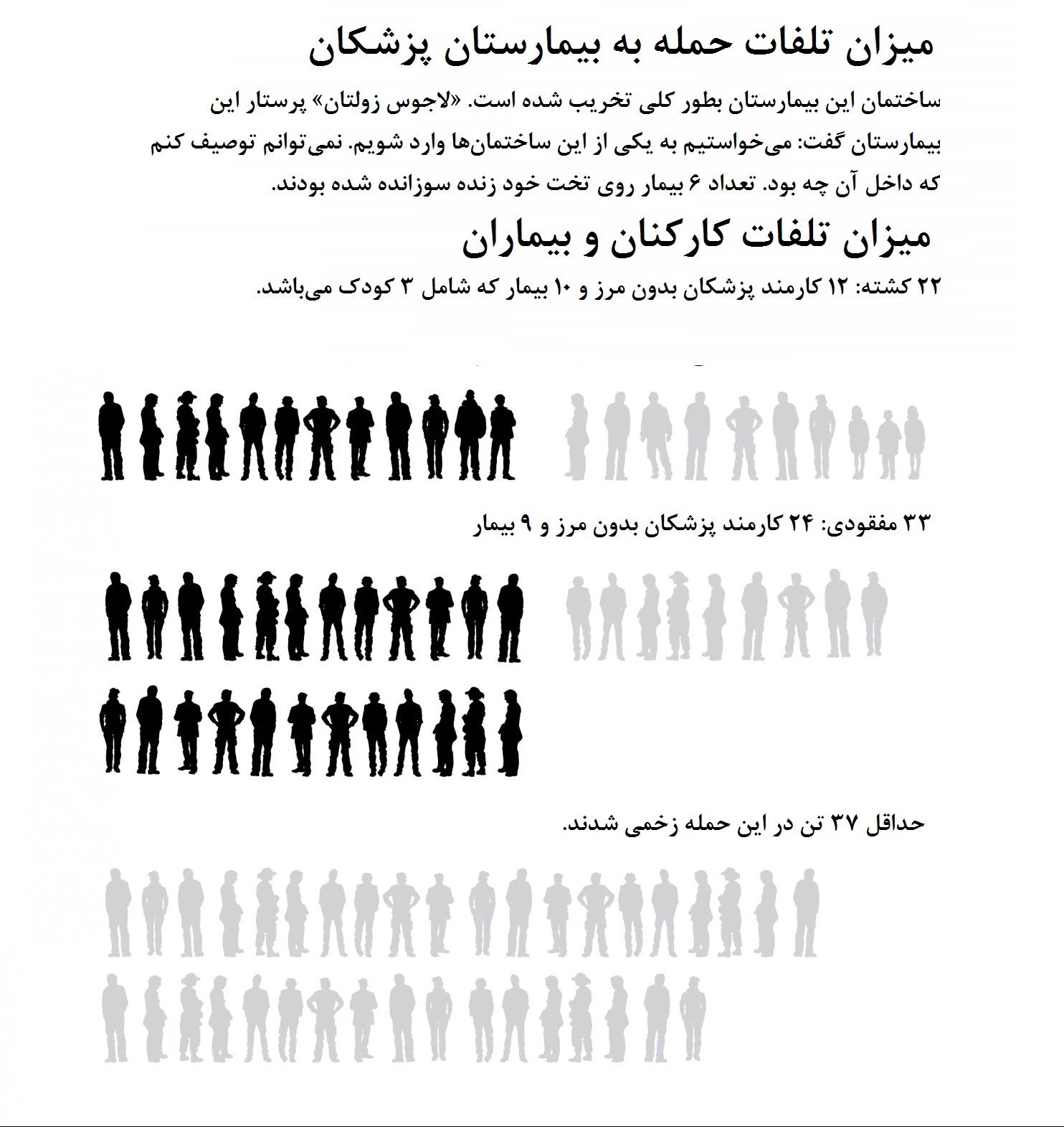 زمانی که پزشکان به ساختمان سوخته بیمارستان رفتند، با اجساد بیمار و همکاران خود مواجه شدند. برخی از کارمندان شروع به بیرون کشیدن آنها از زیر آوار کردند و کسانی را که زخمی شده بودند معالجه میکردند. یکی از پزشکان این بیمارستان در حالی پشت میز خود کشته شده بود که پزشک دیگری تلاش میکرد تا جراحی اضطراری را برای نجات او انجام دهد.
