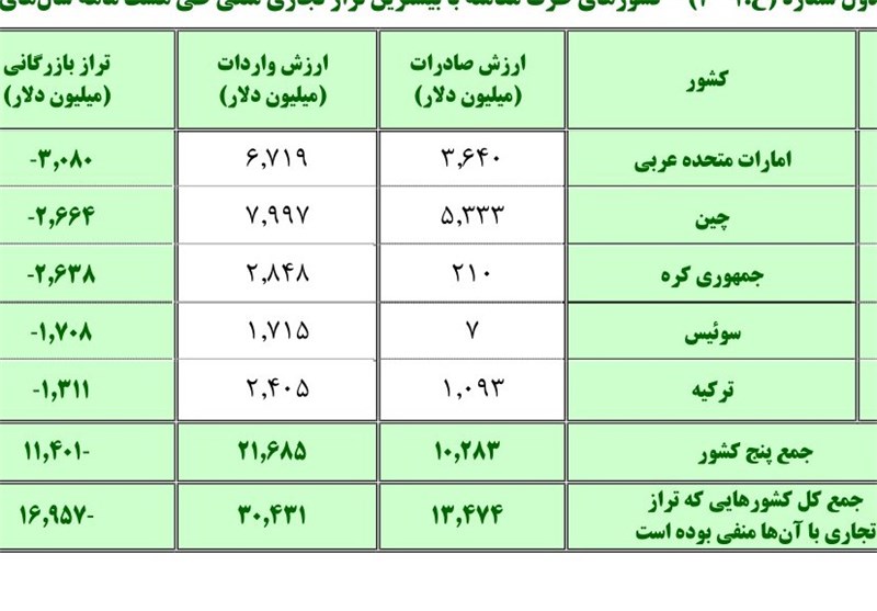 بر این اساس، ایران در تجارت با امارات متحده عربی با تزار تجاری منفی 3 میلیارد و 80 میلیون دلار در رتبه اول، چین با منفی 2 میلیارد و 664 میلیون دلار رتبه دوم، کره جنوبی با منفی 2 میلیارد و 638 میلیون دلار رتبه سوم، سوییس با منفی یک میلیارد و 708 ملیون دلار رتبه چهارم و ترکیه با منفی یک میلیارد و 311 میلیون دلار رتبه پنجم کشورهایی هستند که ایران در تجارت با آنها بیشترین ضرر را کرده است