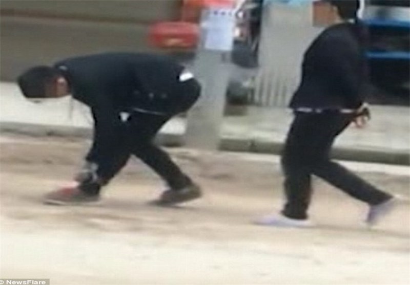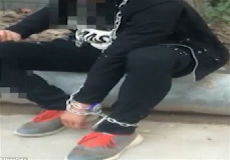 تصاویر منتشر شده نشان می دهد مادر چینی با یک دستبند، دست چپ فرزندش را به پای چپ وی بسته و او را مجبور کرد تا در خیابان راه برود.