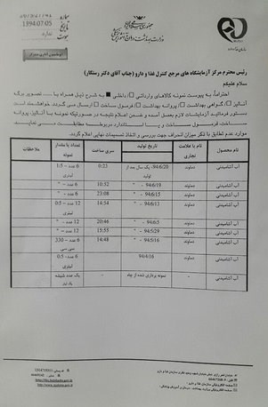 وی در پاسخ به سوالی درباره اظهارات شرکت آب معدنی دماوند مبنی بر اینکه حدود دو سال است آب معدنی دماوند تولید نمیشود، گفت: در ارزیابیهای انجام شده در شش ماه دوم سال 93 و همچنین شش ماه اول سال 94 مواردی از این آب معدنی در بازار بود که توسط آزمایشگاه مرجع مورد آزمایش قرار گرفت و وجود آلودگی در آن مشخص شد، به همین دلیل تولید آب معدنی دماوند به صورت کامل متوقف و پروانه آن باطل شد چرا که آب معدنی باید بدون پالایش از عمق زمین وارد بطری شود و در عین حال باید عاری از آلودگی باشد. این در حالی است که این ضوابط در مورد آب معدنی دماوند انجام نمیشود .