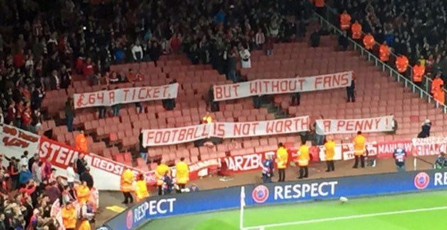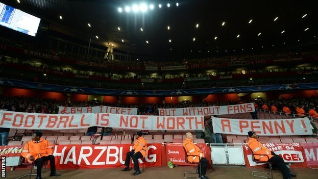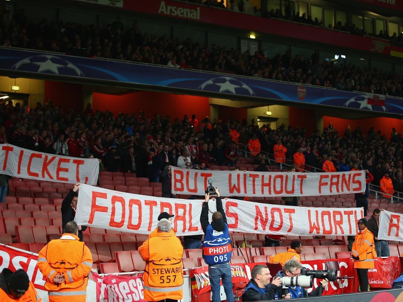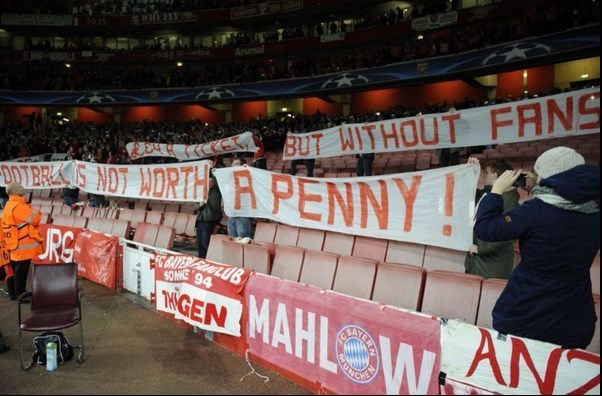 هواداران بایرن مونیخ برای نشان دادن اعتراض خود به گرانی بلیتهای ورود به ورزشگاه خانگی آرسنالیها، ورزشگاه امارات با خود پلاکاردهایی را به داخل ورزشگاه بردند که روی آنها نوشته شده بود: «64 پوند برای یک بلیت، اما بدون هواداران فوتبال یک پنی هم نمیارزد».