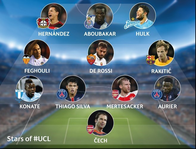 مدافعان: سرژی آئوریه (پاریسنژرمن)، پر مرتهساکر (آرسنال)، تیاگو سیلوا (پاریسنژرمن) و پا کوناته (مالمو)