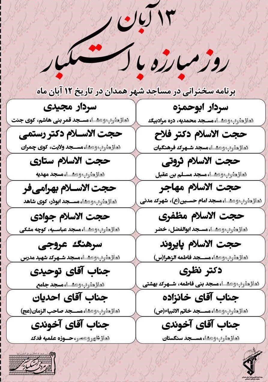 بقایی عنوان کرد: سخنرانیهای حجتالاسلام مظفری در مسجد ابوالفضل(ع) خضر، حجتالاسلام پایروند در مسجد فاطمهالزهرا شهرک مدنی و عروجی معاون هماهنگکننده سپاه همدان را در مسجد شهرک مدرس در نظر گرفته شده است.