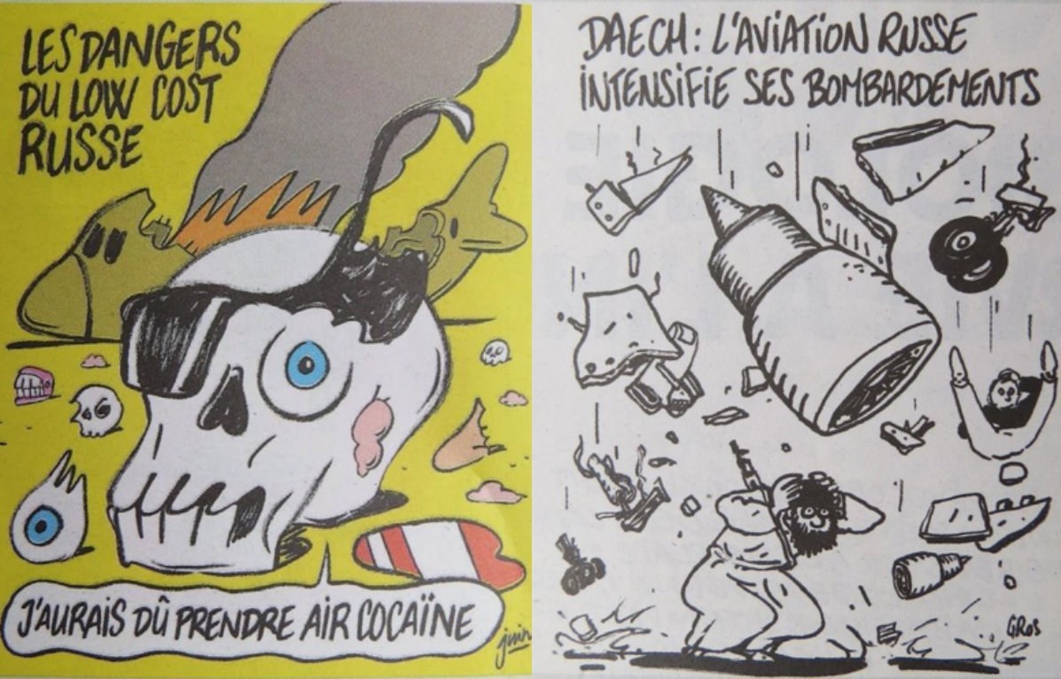 روسیه به شدت نشریه شارلی‌ابدو فرانسه را به دلیل دو کاریکاتوری که در آن سقوط هواپیمای روسی در صحرای سینا به تصویر کشیده‌ شده‌اند، مورد انتقاد قرار داد. در این رویداد 224 سرنشین هواپیما که عمدتا روس بودند کشته شدند.