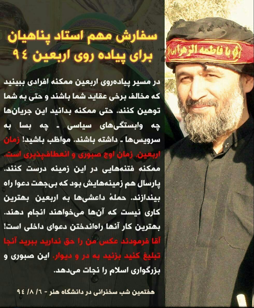 علیرضا پناهیان در هیئت دانشگاه هنر گفت: بهترین کاری که آنها می‌خواهند بکنند حملۀ داعشی‌ها و تروریست‌ها به اربعین نیست، بهترین کار آنها راه‌انداختن دعوای داخلی است، آقا فرمودند: عکس من را حق ندارید ببرید آنجا تبلیغ کنید بزنید به در و دیوار.