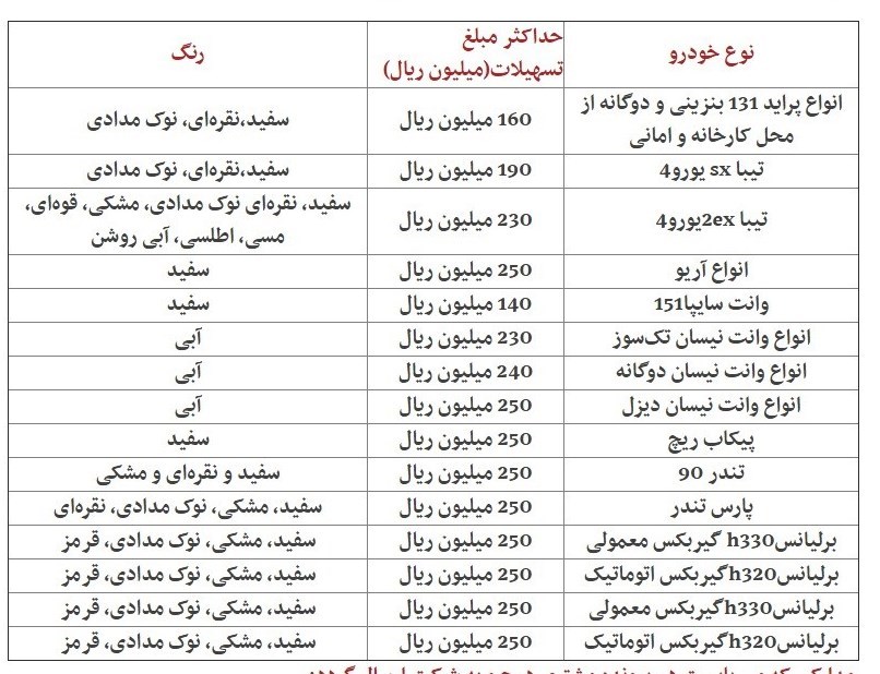 به گزارش خبرنگار اقتصادی خبرگزاری تسنیم، شرکت ایران خودرو شرایط فروش اعتباری محصولات خود را در قالب وام 25میلیون تومانی خرید خودرو به نمایندگیها ابلاغ کرد. افراد متقاضی برای خرید محصولات این شرکت، باید فرم قرارداد فروش رهنی، وکالتنامه فک پلاک، فرم تعهدنامه، پرینت حساب جاری صادر کننده چک (30 گردش آخر)، گواهی امضای محضری متقاضی و صادر کننده چک و صادر کننده چک ضمانت را بههمراه یک فقره چک ضمانت بههمراه کل مبلغ اصل و فرع وام از شخص ثالث یا از شخص صاحب چک با امضای شخص ثالث را کنار کپی شناسنامه و کارت ملی خود و صادر کننده چک به نمایندگیهای فروش این شرکت ارائه کنند.