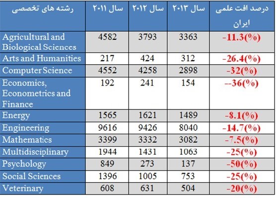 همانگونه که در جدول بالا میبینیم، در سال 2013 افت علمی کشور در برخی رشتهها در این نمایه به نزدیک 50 درصد رسیده است.
