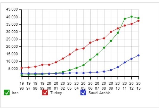 از سوی دیگر در نمودار رشد علم میبینیم که کشور ترکیه در صورت حفظ افت علمی ایران، بهزودی از ایران در نمایه Scopus هم سبقت خواهد گرفت و عنوان اولین را در منطقه خاورمیانه به خود اختصاص خواهد داد.