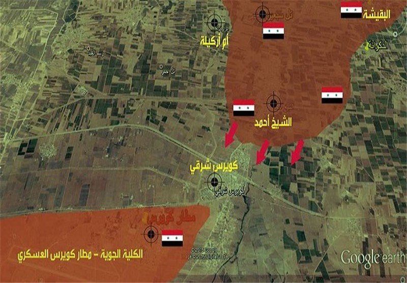 از سوی دیگر ارتش سوریه با حمایت گروههای مقاومت مردمی بعد از شکست حصر فرودگاه نظامی کویرس بهشدت با گروه تروریستی داعش اطراف این فرودگاه درگیر شده است. بر اساس این گزارش بخشی از نیروهای شناسایی ارتش سوریه توانستند خود را به دیوارهای فرودگاه برسانند و گروههای دیگر نیز در تلاش هستند تا خود را به فرودگاه برسانند.