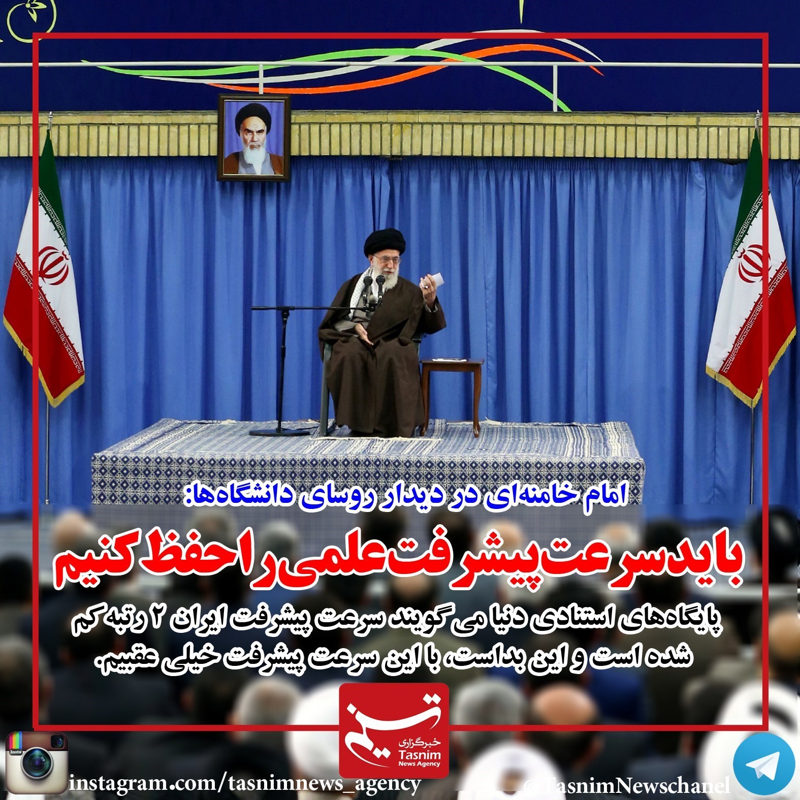 حضرت آیت‌الله خامنه‌ای تأکید کردند: پایگاه‌های استنادی دنیا می‌گویند سرعت پیشرفت ایران 2 رتبه کم شده است.