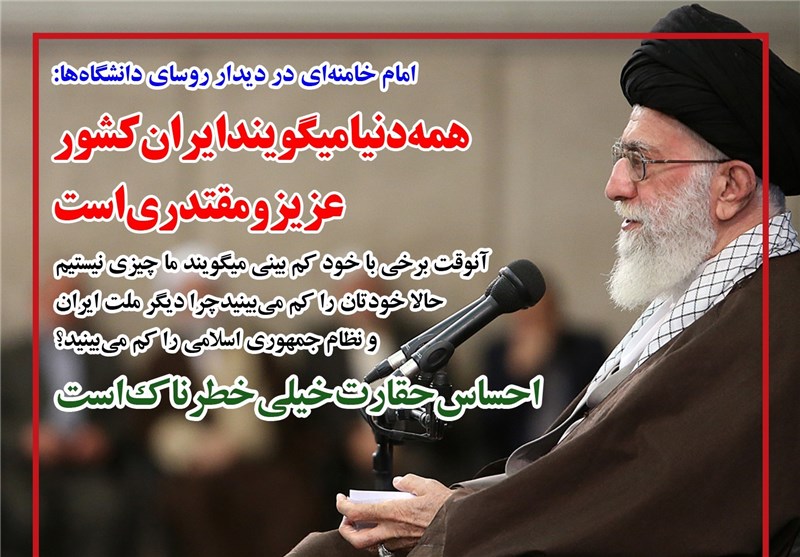 امام خامنه ای در دیدار روسای دانشگاه ها فرمودند: آن وقت برخی با خود کم بینی می‌گویند ما چیزی نیستیم حالا خودتان را کم می بینید چرا دیگر ملت ایران و نظام جمهوری اسلامی را کم می بینید؟ احساس حقارت خیلی خطرناک است.