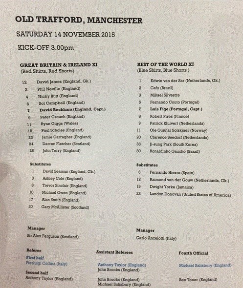 در این بازی برای تیم منتخب بریتانیا و ایرلند ستارگانی همچون دیوید جیمز، فیل نویل، نیکی بات، سل کمپبل، دیوید بکام (کاپیتان)، پیتر کراوچ، رایان گیگز، پل اسکولز، جیمی کاراگر، دارن فلچر و جان تری در ترکیب اصلی قرار داشتند و دیوید سیمن، اشلی کول، ترور سینکلر، مایکل اوون، آلن اسمیث و گری مک آلیستر روی نیمکت قرار داشتند. سرالکس فرگوسن، سرمربی اسطورهای منچستریونایتد هم هدایت تیم منتخب بریتانیا و ایرلند را برعهده داشت.