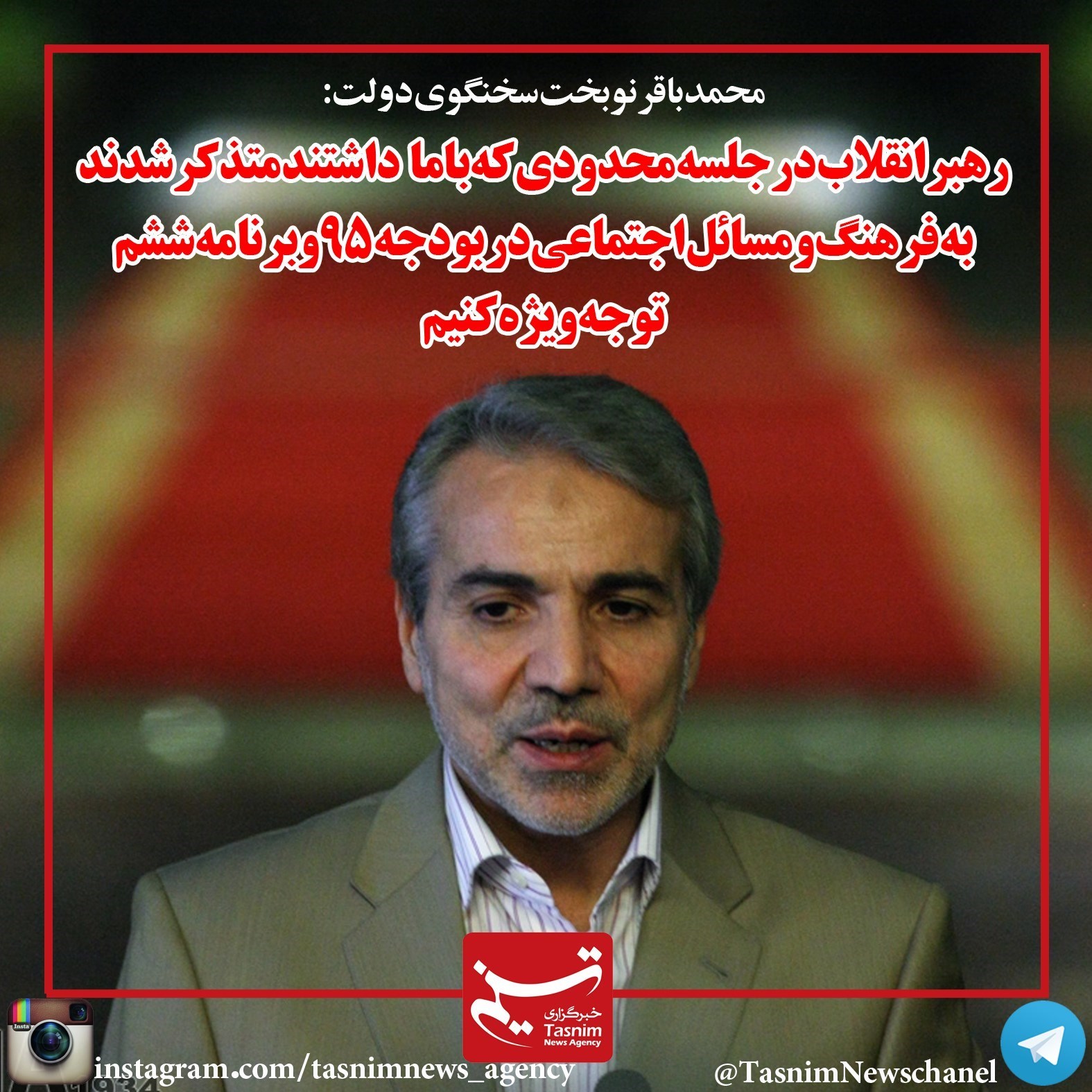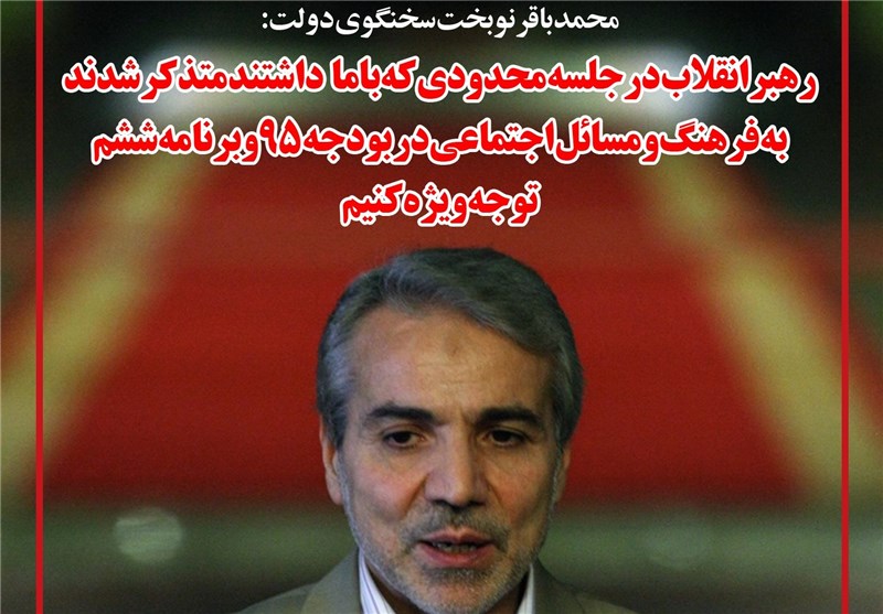 سخنگوی دولت گفت: رهبر انقلاب در جلسه محدودی که با ما داشتند، متذکر شدند تا به فرهنگ و مسائل اجتماعی در تدوین لایحه بودجه 95 و برنامه ششم توسعه توجه ویژه‌ای داشته باشیم.