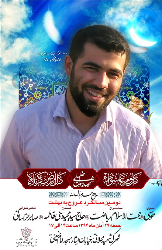 "شهید محمدحسن خلیلی" معروف به "رسول"، از مدافعان حرم حضرت زینب(س) روز دوشنبه 27 آبانماه92 به دست وهابیون تکفیری به مقام رفیع شهادت نائل شد. چند روز پس از عاشورای دو سال گذشته، خانواده شهید رسول خلیلی خبر شهادت پسرشان را که به صورت داوطلبانه به عنوان مدافع حرم حضرت زینب(س) به سوریه رفته بود را شنیدند. او درست چند روز قبل از تولدش در نزدیکی حرم حضرت رقیه (س) به شهادت میرسد و جشن 27 سالگی خود را در محضر دردانه امام حسین(ع) و خاندان اهل بیت(ع) برگزار کرد.