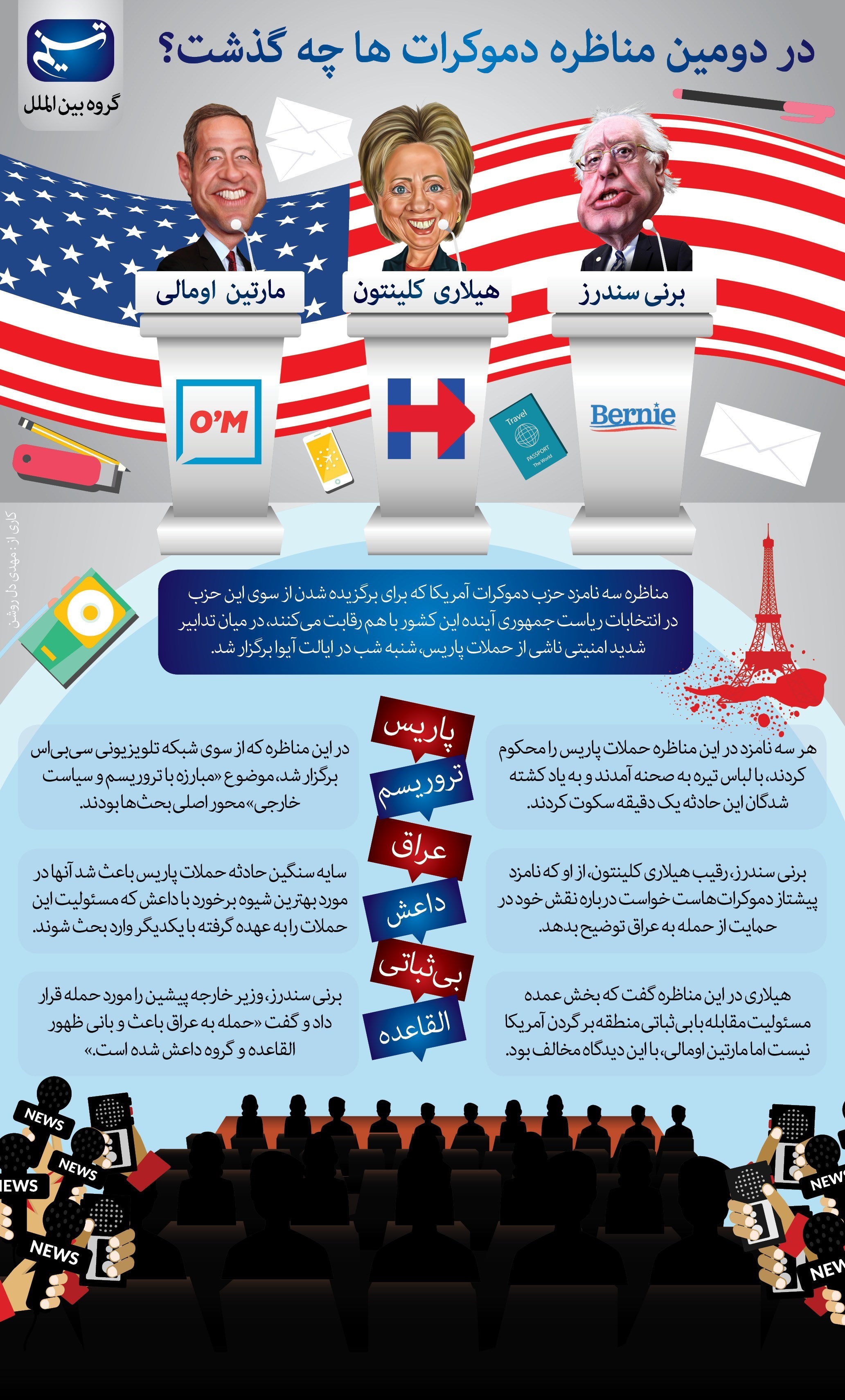 مناظره سه نامزد حزب دموکرات آمریکا که برای برگزیده شدن از سوی این حزب در انتخابات ریاست جمهوری آینده این کشور با هم رقابت می‌کنند، در میان تدابیر شدید امنیتی ناشی از حملات پاریس، شنبه شب در ایالت آیوا برگزار شد.