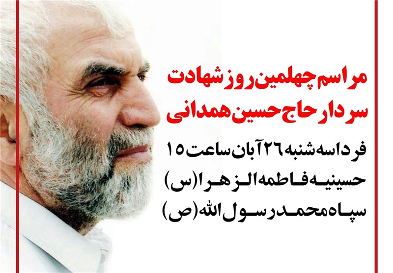 مراسم چهلمین روز شهادت سردار حسین همدانی فردا با حضور فرماندهان و مسئولان عالی‌رتبه کشوری و لشکری در حسینیه فاطمه الزهرا(س) برگزار می‌شود.