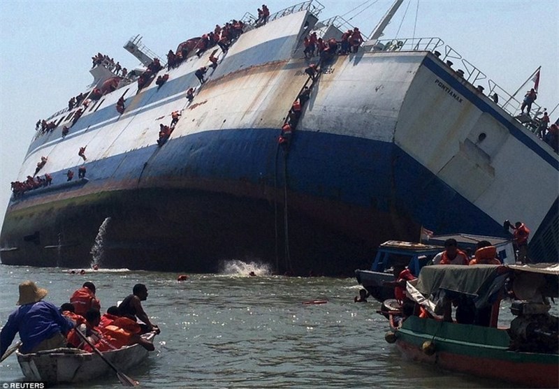 شماری از مسافران یک کشتی در حال غرق در اندونزی توانستند با طناب و قایق‌های نجات، جان سالم به در ببرند.