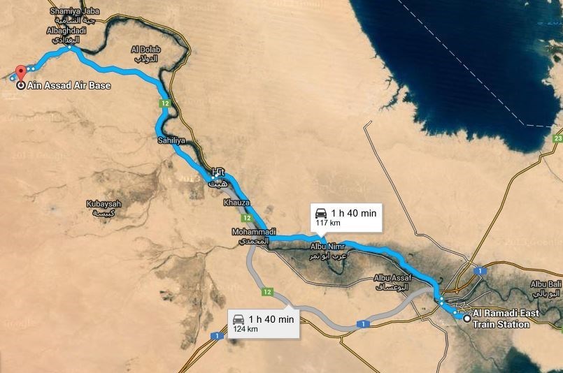 فاصله فرودگاه «الاسد» که نیروهای هوایی آمریکایی مستقر هستند، تا مرکز آموزشی الرمادی که تحت کنترل داعش درآمد
