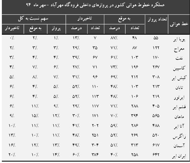 هواپیمایی آسمان در مهرماه 49 درصد پروازها و زاگرس نیز 48 درصد پروازهای خود را با تاخیر انجام دادند.