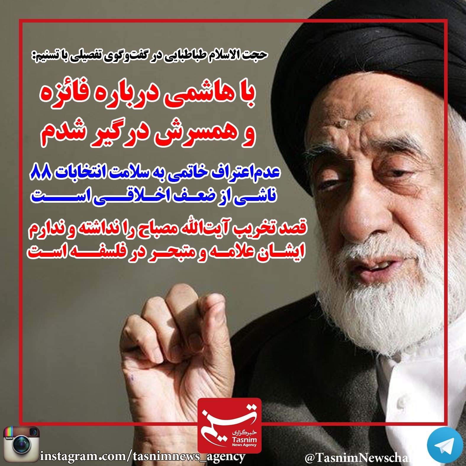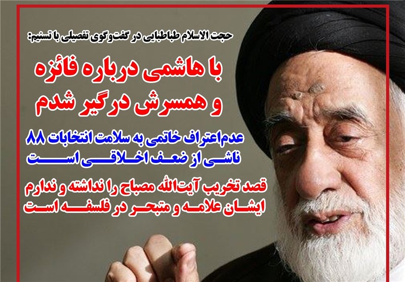 حجت‌الاسلام والمسلمین طباطبایی گفت: "مثلاً در قضیه فائزه با آقای هاشمی درگیر شدم. اظهاراتی کرده بود خانم فائزه، من به آقای هاشمی گفتم: این چه حرفهایی است؟ آقای هاشمی گفت: "خودت به او بگو". من گفتم: وقتی شما هستی، چرا من بگویم؟...".