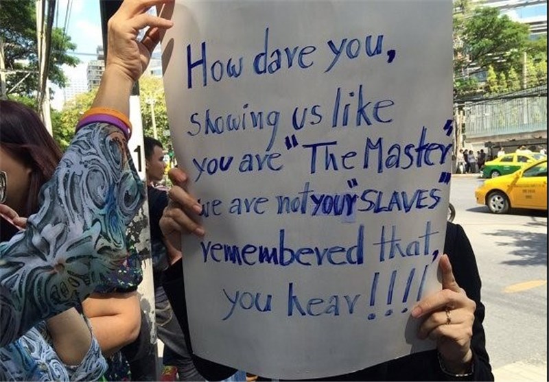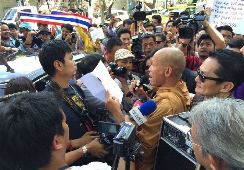 به نوشته روزنامه "خاوسد"، تجمع کنندگان معترض مقابل سفارت آمریکا در شعارهایی به زبان تایی و انگلیسی مخالفت خود را با دیدگاههای دیپلمات بلندپایه آمریکا ابراز داشتند. دهها مامور پلیس مقابل سفارت آمریکا قرار گرفتند، اما تجمع کنندگان در حالی که پلاکارهایی با نوشته «به خانهات برگرد» و «اینجا تایلند است نه ایالات متحده» از آمریکا خواستند در امور داخلی این کشور دخالت نکند. «آبوت بودا ایسارا» فعال بودایی، گفت: شما هیچ حق و قدرتی ندارید… ما برده آمریکا نیستم.