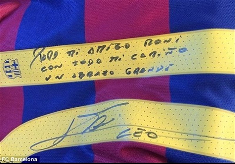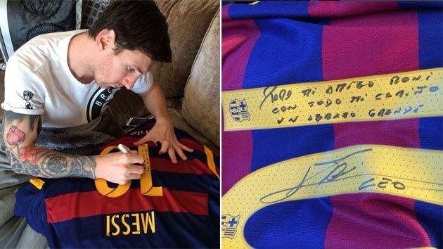 مسی روی این پیراهن با دستخط خود این جمله را نوشته است: برای دوستم «رونی» از صمیم قلب. بهترین آرزوها را برایت دارم.»