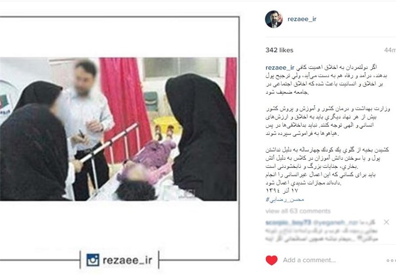 به گزارش حوزه احزاب خبرگزاری تسنیم به نقل از پایگاه اطلاع رسانی رضایی، سردار سرلشکر محسن رضایی در آخرین مطلب ارسالی در صفحه شخصی خود در اینستاگرام، به شکافتن بخیههای کودک چهارساله توسط مسئولان بیمارستان اشرفی اصفهانی در اصفهان واکنش نشان داد.