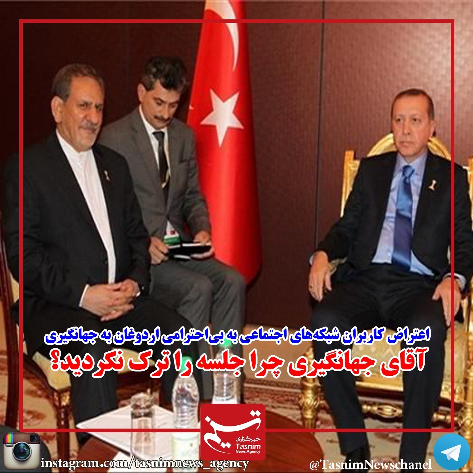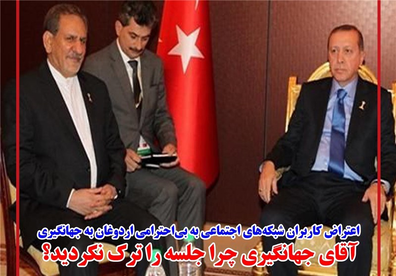 پس از بی‌احترامی اردوغان رئیس‌جمهور ترکیه به جهانگیری معاون اول رئیس‌جمهور کشورمان در دیداری که اخیراً انجام شده است، کاربران شبکه‌های اجتماعی با انتشار عکسهایی به این مسئله اعتراض کردند.
