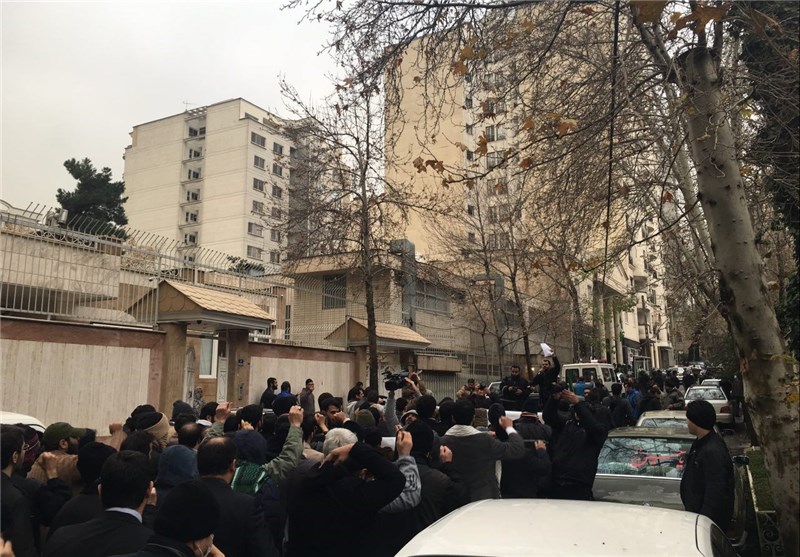 نیروی انتظامی نیز تلاش دارد نظم را حفظ کند و از نزدیک شدن معترضان به سفارت نیجریه جلوگیری نماید.